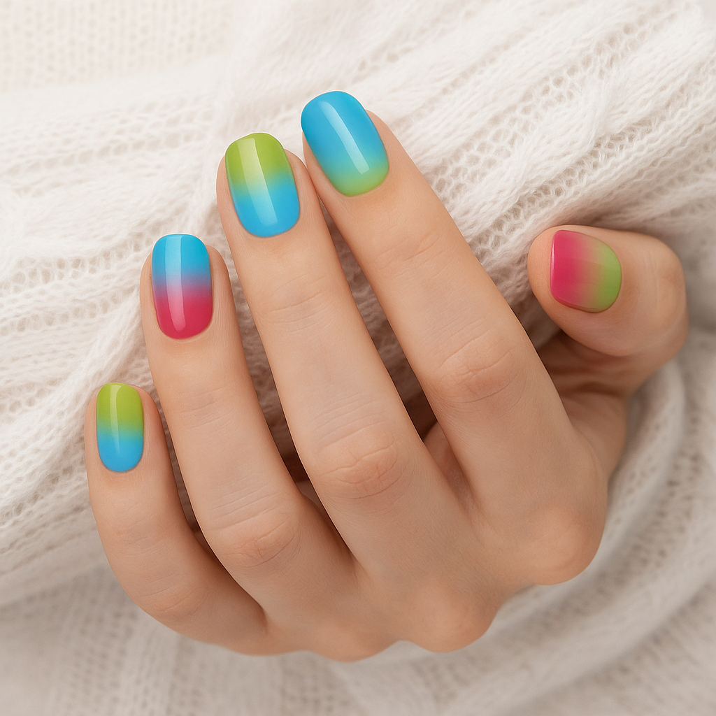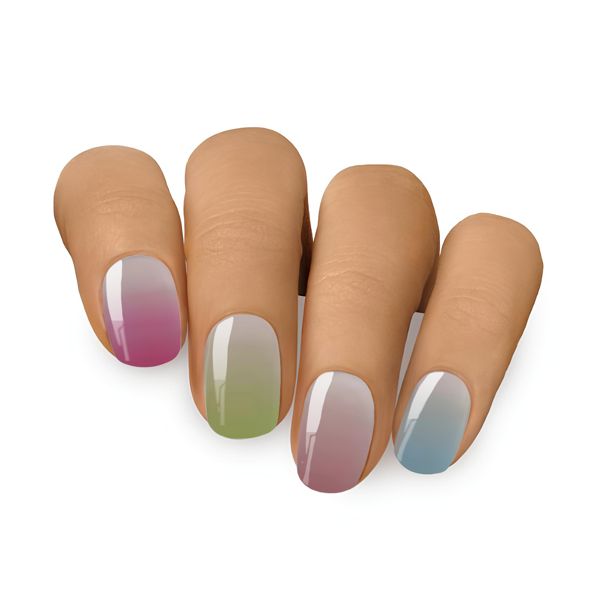 Բազմագույն թափանցիկ անցում՝ համատեղելով նուրբ վարդագույն, մեղմ կանաչ և երկնագույն կապույտ։ Պոետիկ և թեթև մանիկյուր, որը հիշեցնում է ամառային երազի երանգները լուսաբացին։