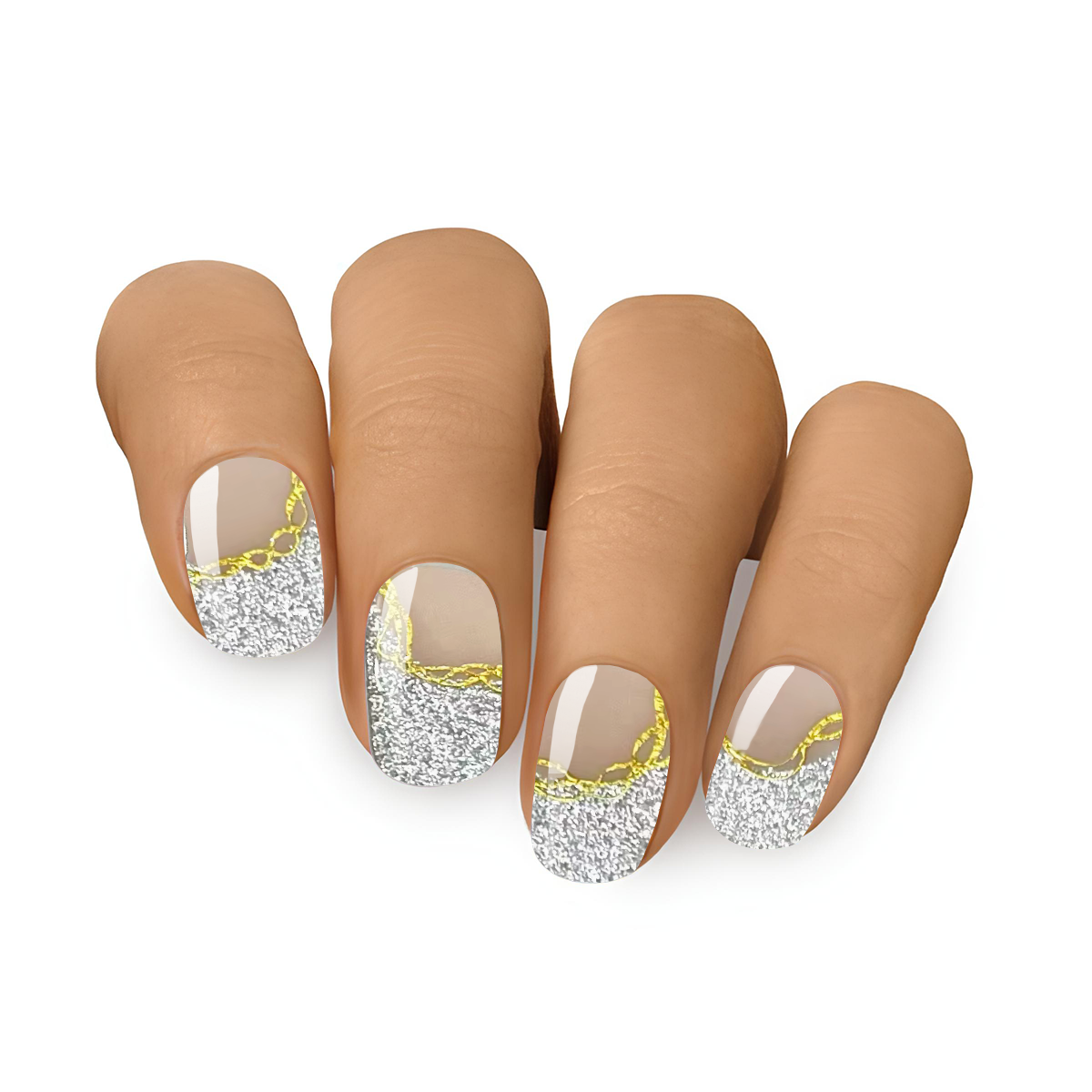 Շքեղ դիզայն արծաթագույն փայլուն ալիքներով և ոսկեգույն եզրագծերով, շքեղ և նրբագեղ մանիկյուրի համար։ Հատուկ ընդգծեք ձեր ոճը փայլով։