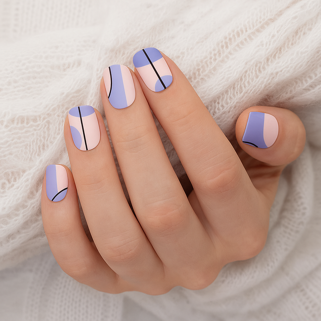 Գրաֆիկական դիզայն, որը ներշնչված է ժամանակակից արվեստից, սև էլեգանտ գծերով և լավանդայի և նյուդի փափուկ երանգներով։ Իդեալական է միաժամանակ շքեղ, արվեստական և արդիական տեսքի համար։