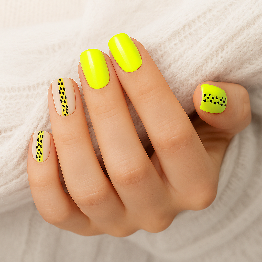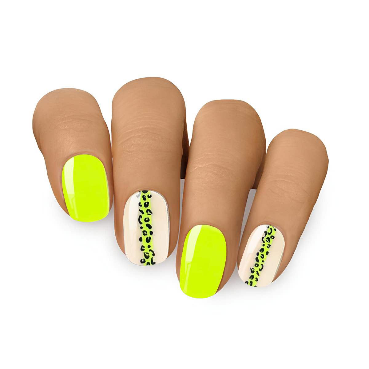 Մեկ պայծառ դեղին գույն, որը համակցված է սև լեոպարդի տպագրությամբ նյուդ ֆոնի վրա, ստեղծելով վայրի և շատ արդիական մանիկյուր։ Հիանալի նրանց համար, ովքեր համարձակ և կենդանի ոճ են ընտրում։