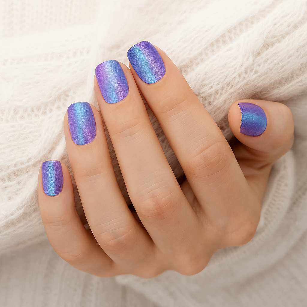 Մոգական անցում սառցե կապույտի և մարգարիտային երանգներով լավանդայի միջև: Նուրբ և լուսավոր մանիկյուր, ներշնչված գոհարեղենի կախարդական փայլերից: